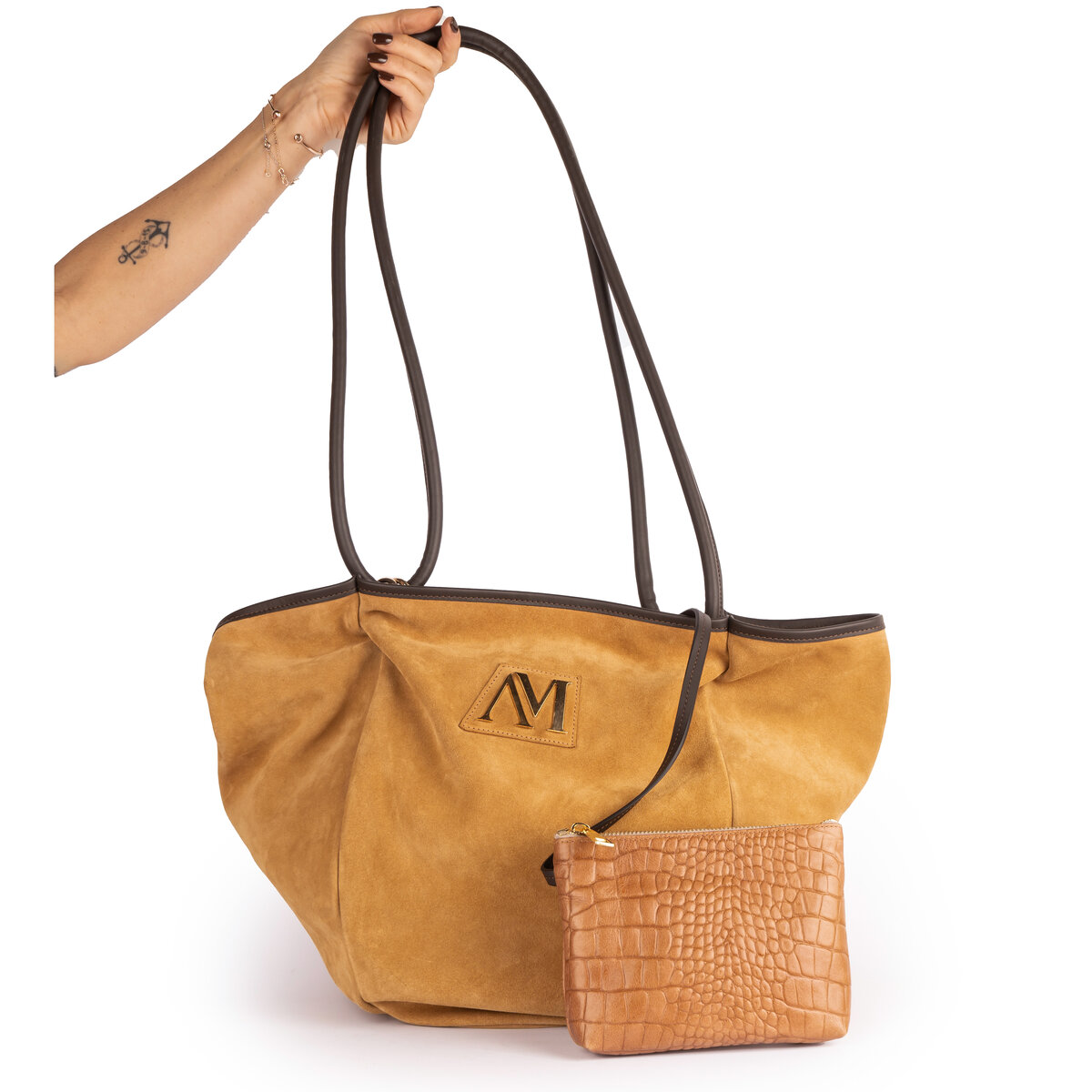 Camoscio beige, manici in pelle marrone alti 46 cm e borsello interno stampa cocco tabacco lungo 17,5 cm e alto 13 cm. Non foderata, base tonda