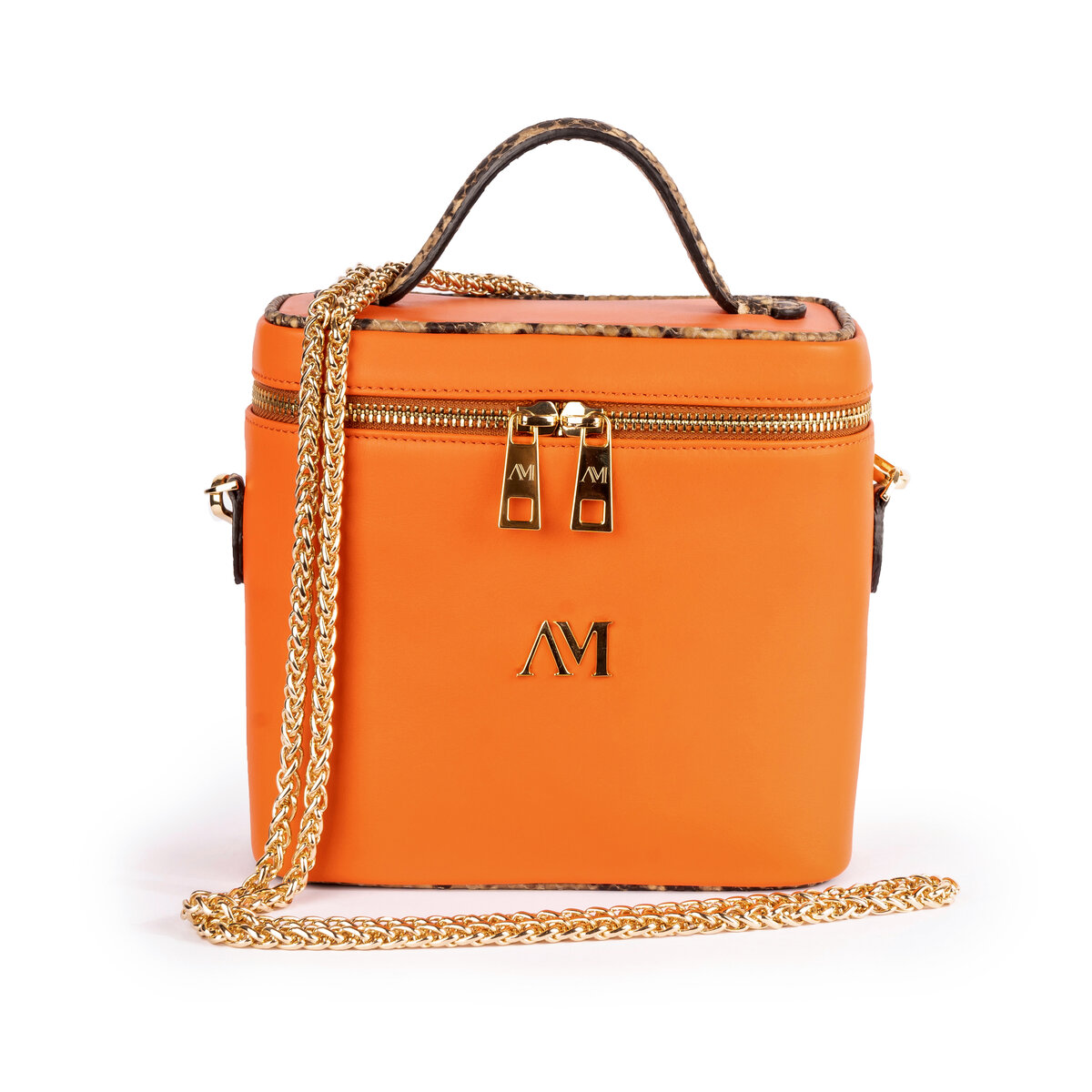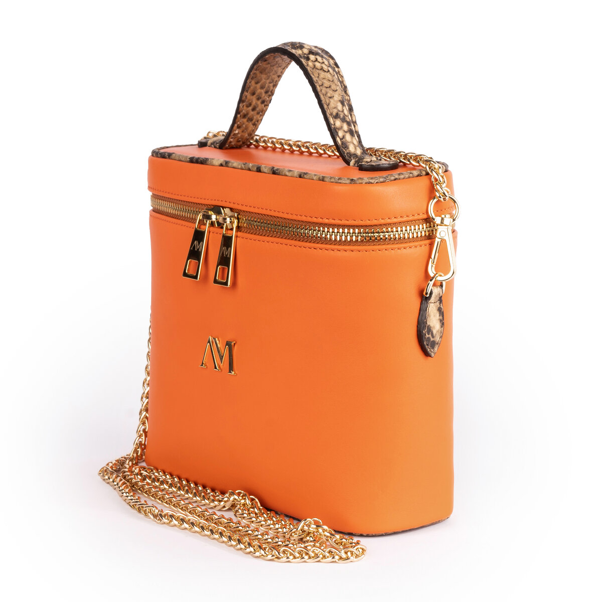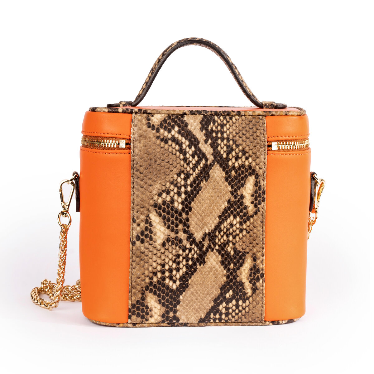 Pelle di vitello arancione, bordi e manicotto stampa pitone, catena oro 1.27 cm, taschino e specchietto interno. fodera moirè nero