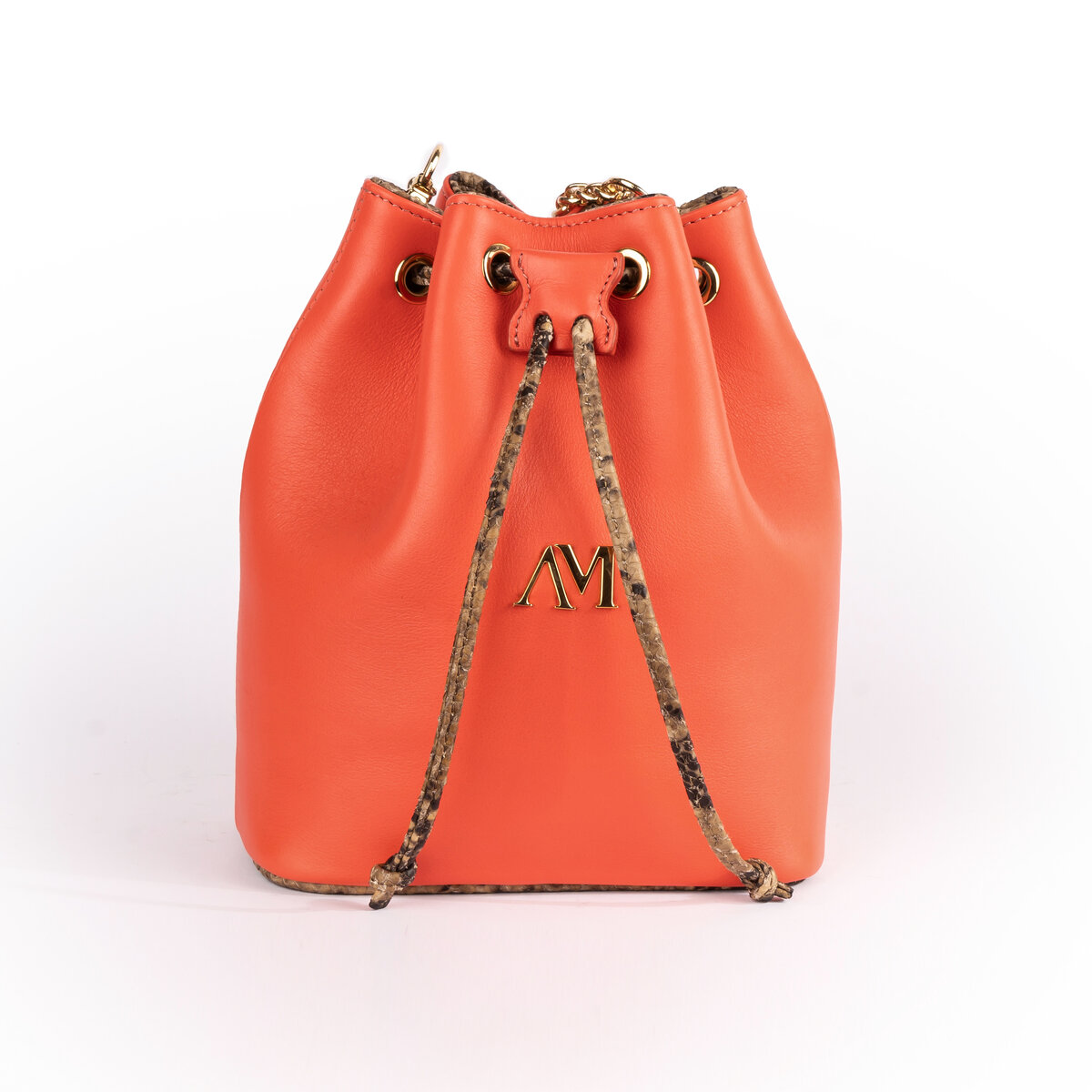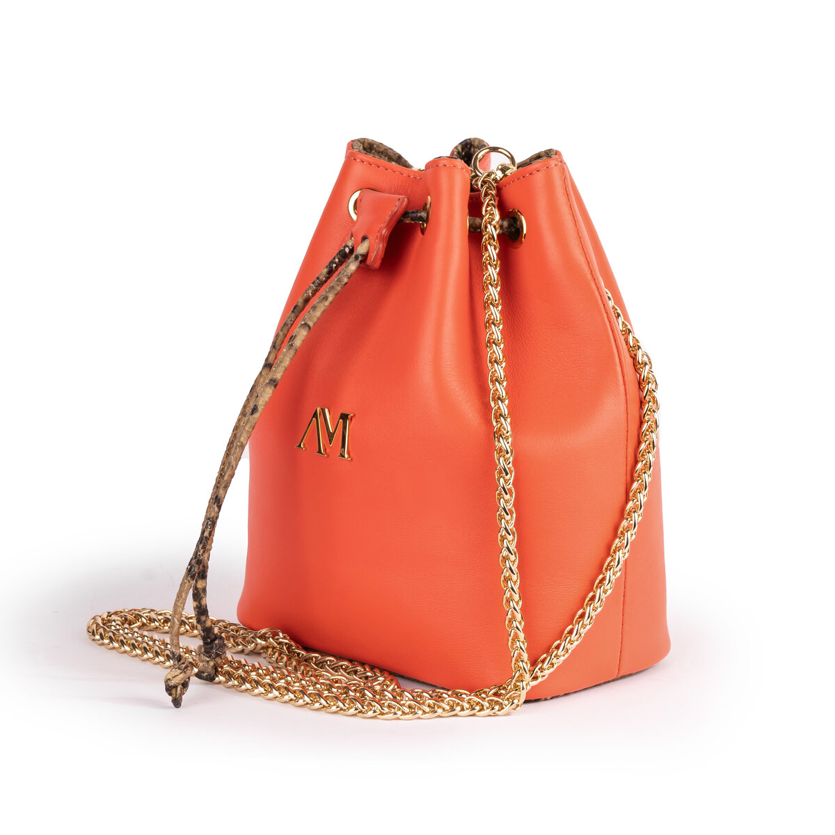 Pelle di vitello rosa salmone, laccetti in pelle stampa pitone, taschino interno, fodera moirè nero e catena oro 1.27 cm