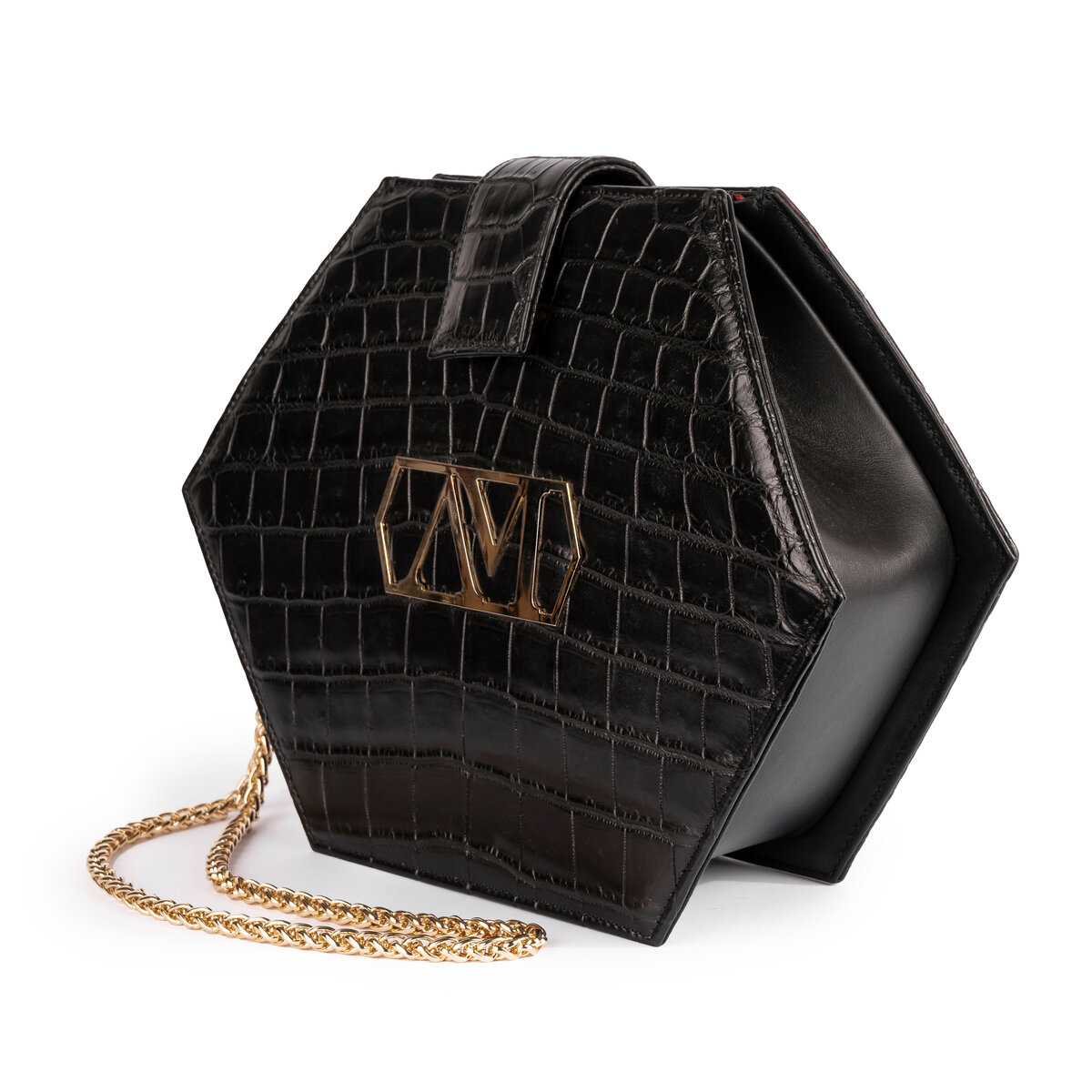 Pelle coccodrillo nero, interno seta rossa, laterali pelle vitello nero, catena oro 1.27 cm, chiusura con linguetta.