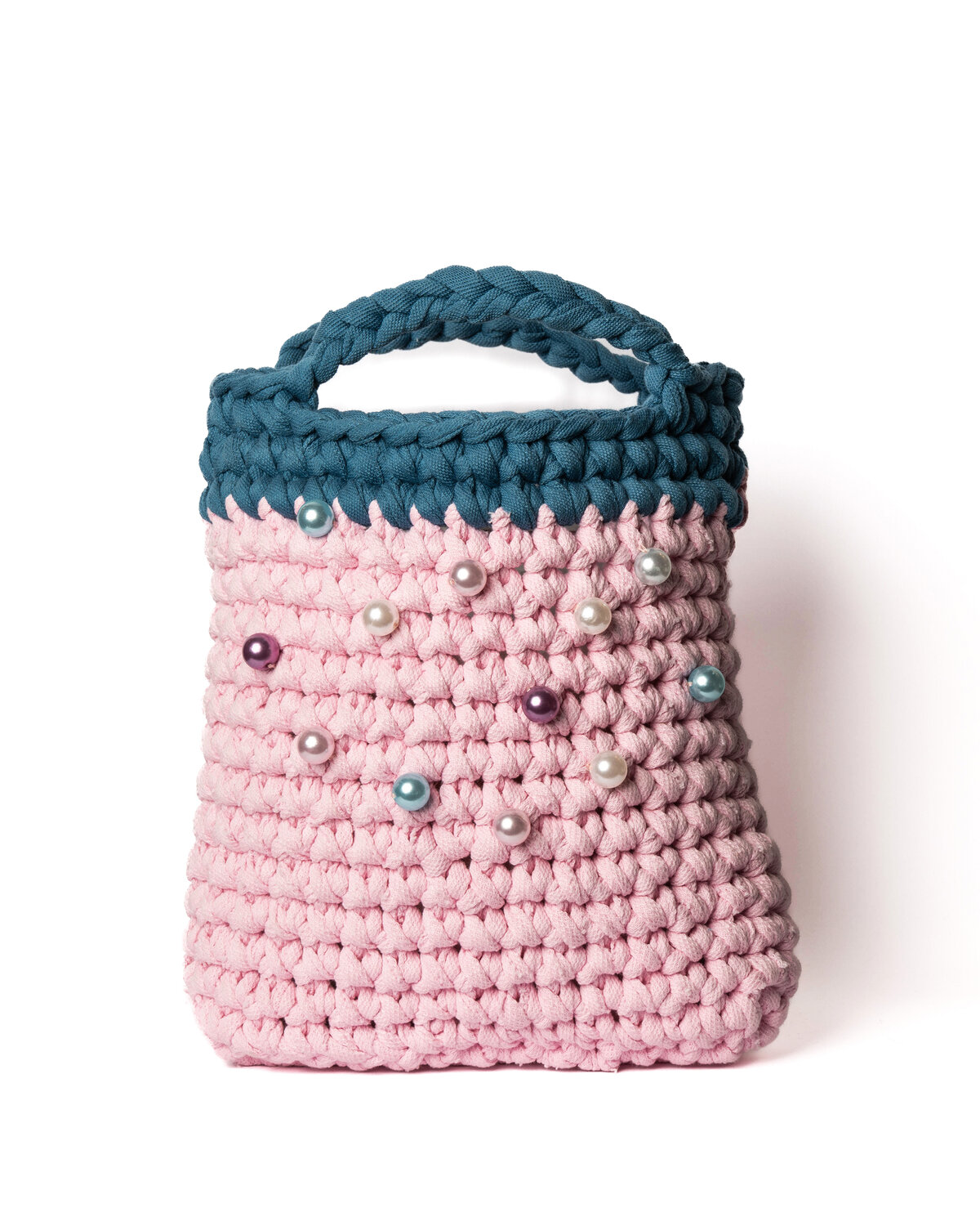 Fettuccia in cotone rigido bicolor rosa e bluette, perle cucite a mano