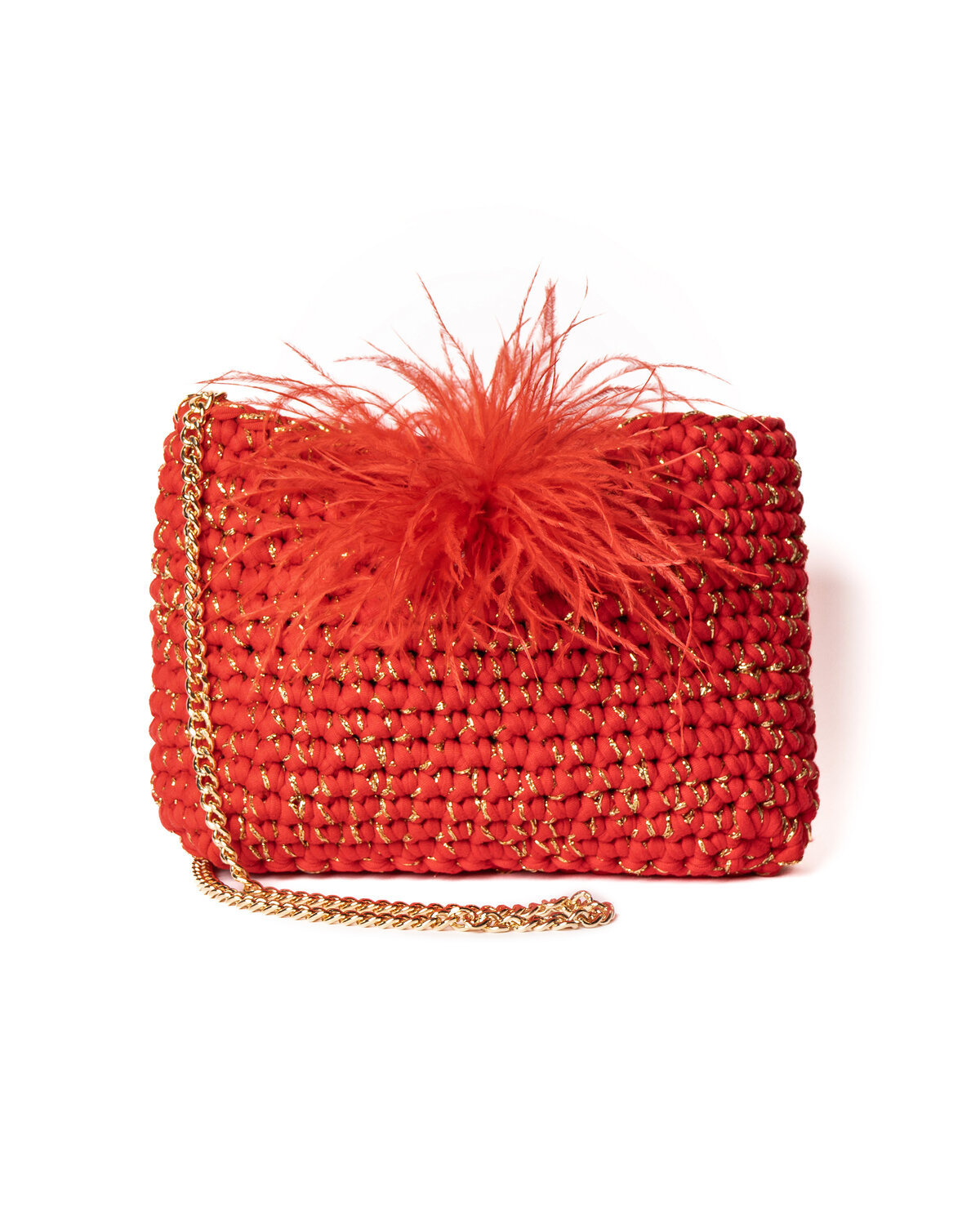 | Colore | Fettuccia in cotone rosso, filo di lurex oro e piuma a spilla applicata |
