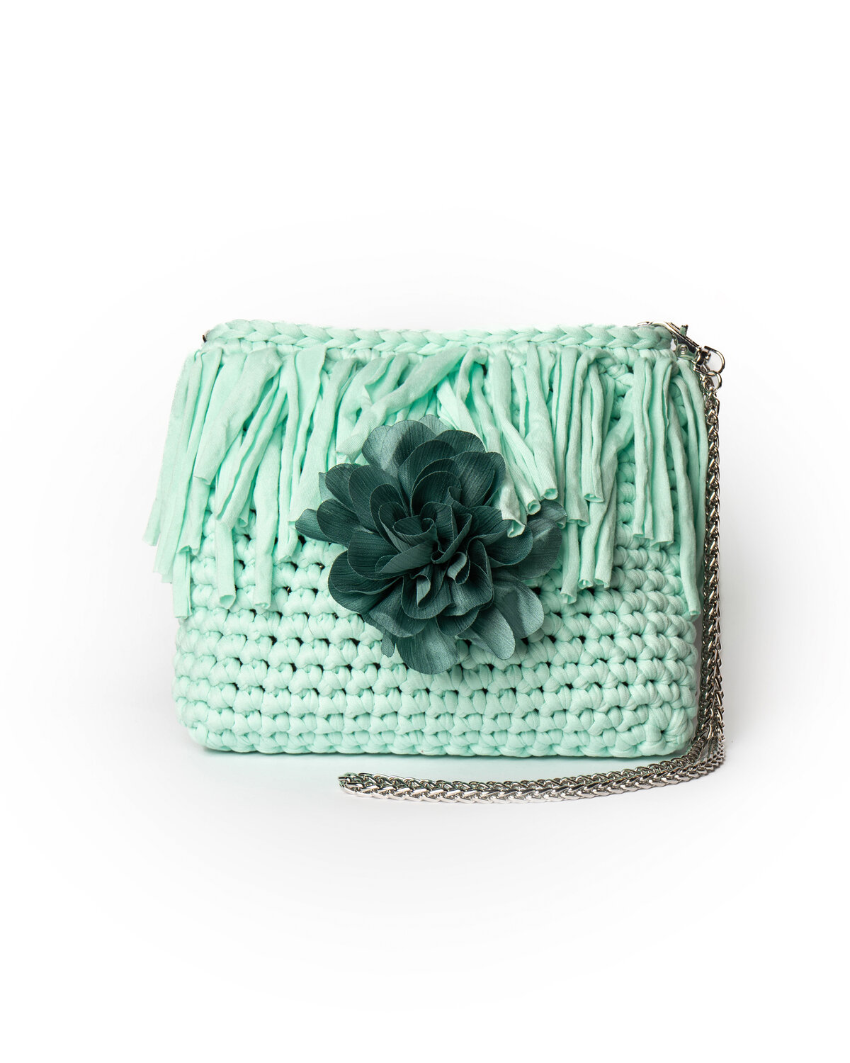 Fettuccia in cotone elastico verde salvia, frange e fiore a spilla applicato