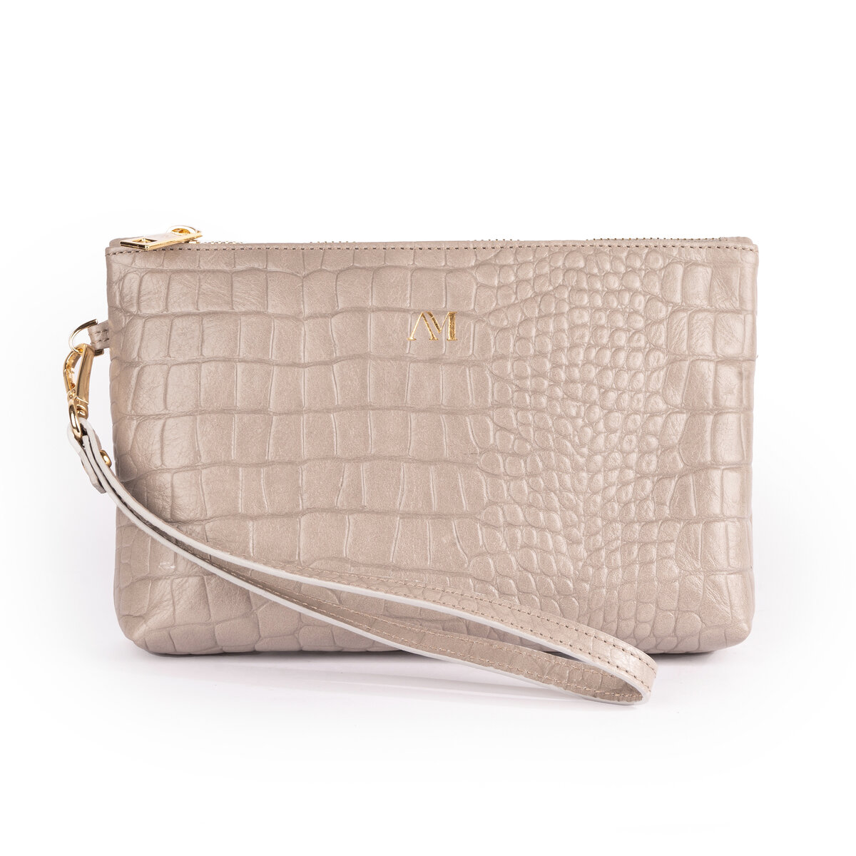 Pelle stampa cocco grigio, manicotto pelle vitello grigia, interno moirè nero