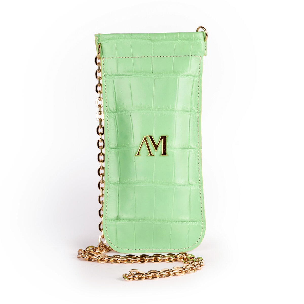 Pelle di coccodrillo verde, catena oro 88 cm, interno moirè nero